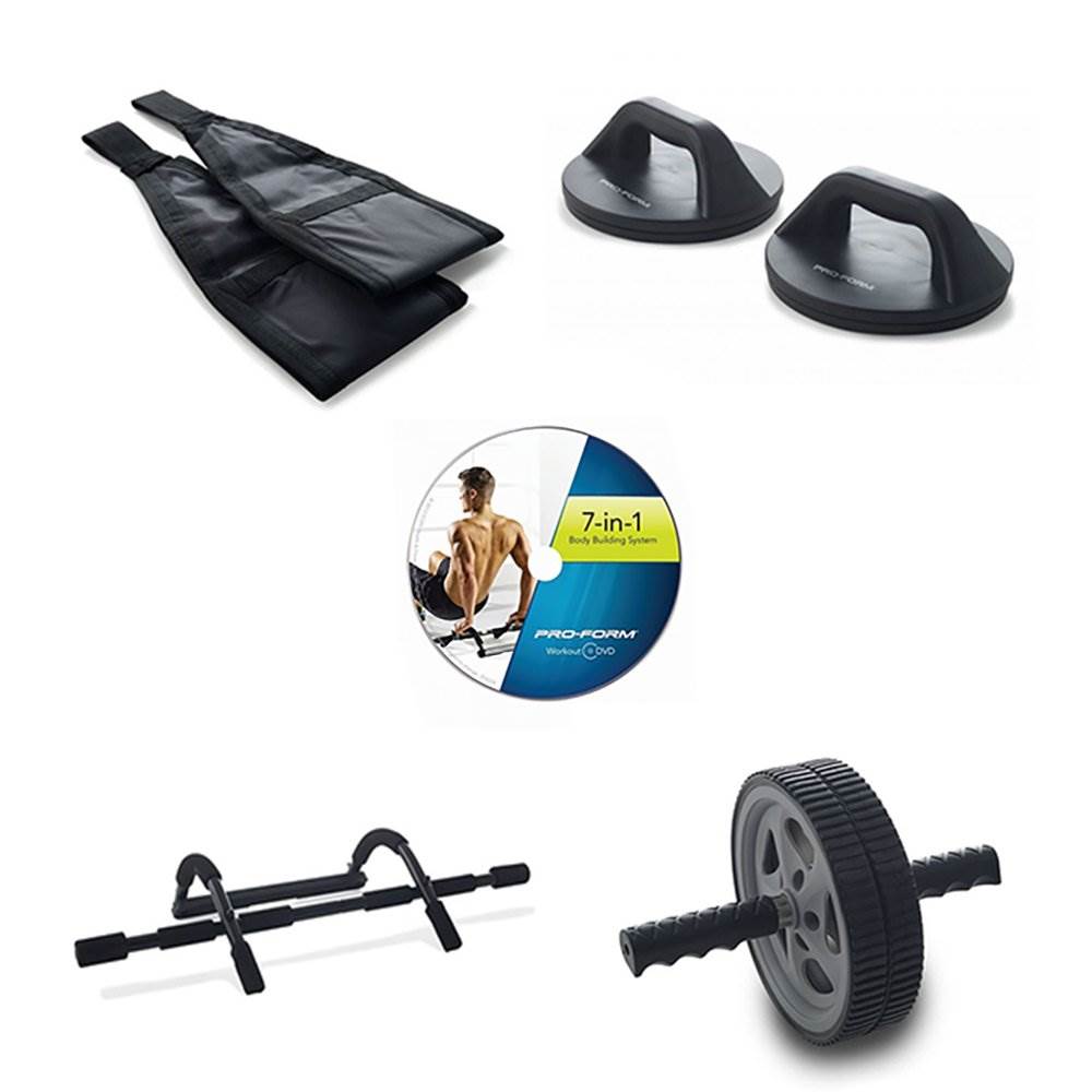 Puedes hacerlo todo y obtener un entrenamiento corporal intenso en casa con esto sistema de entrenamiento 7 en 1 ProForm. Este juego tiene todo lo que necesitas para activar tu modo bestia y transformar todo tu cuerpo. Incluye un gimnasio en la puerta, manijas de empuje giratorias, correas abdominales y centrales, una rueda de tonificación, un DVD de ejercicios, una guía de nutrición y una tabla de ejercicios. La puerta del gimnasio se adapta a la mayoría de los marcos de puertas estándar y no te deja con agujeros ni daños. El sistema 7 en 1 es compacto, conveniente y te ayuda a tonificar tus músculos, conseguir un físico más fuerte. Come mas saludable, entrene duro, escucha tu música y has ejercicio. Con este sistema de entrenamiento ProForm 7 en 1, estarás en camino hacia un cuerpo con el que te sentirás genial.